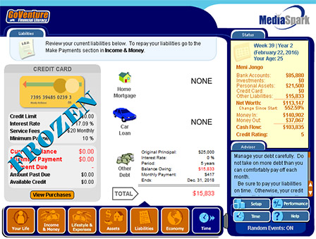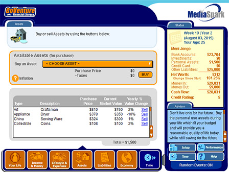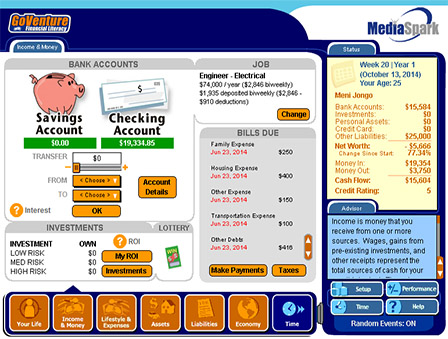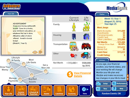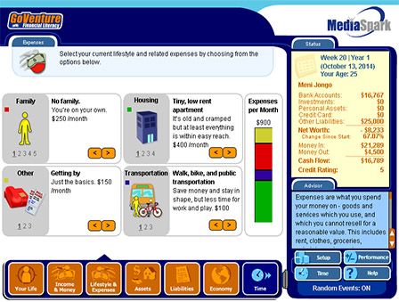 GoVenture Financial Literacy simulation is a realistic software simulation designed to help youth and adults learn about personal money-management decisions in a fun and educational manner. Like a flight simulator for finance and life, GoVenture Financial Literacy enables you to learn by doing. It’s easy to use, visual, interactive, and exciting!