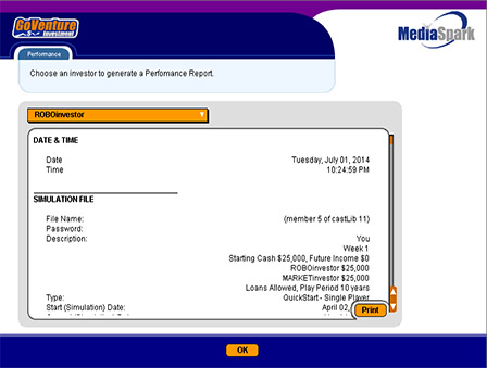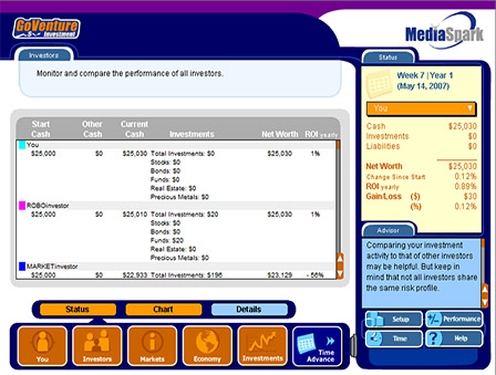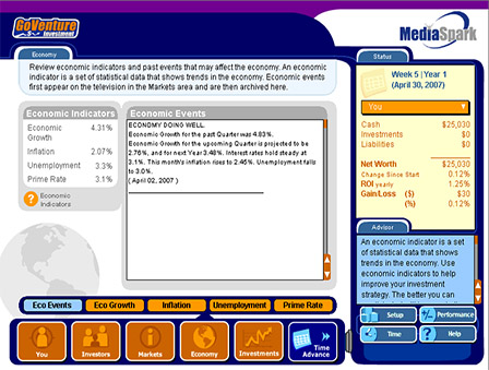 GoVenture Investment simulation is a realistic software simulation designed to help youth and adults learn about personal investment decisions in a fun and educational manner. Like a flight simulator for finance and life, GoVenture Investment enables you to learn by doing without risking your investment dollars. It’s easy to use, visual, interactive, and exciting!
