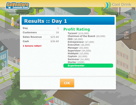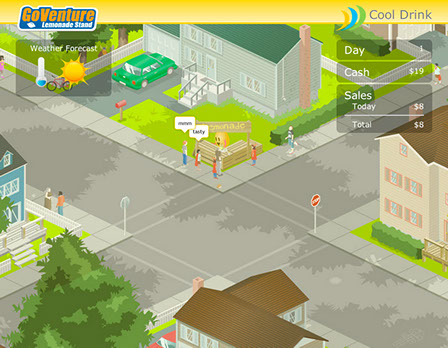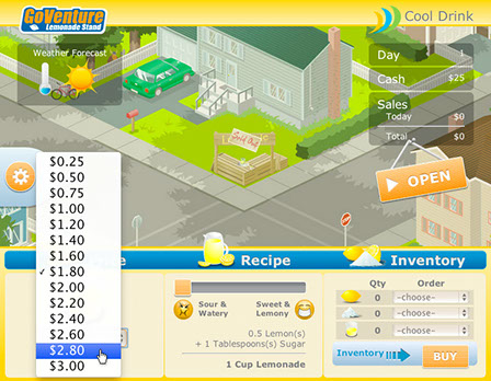 Like a flight simulator for business, GoVenture Lemonade Stand puts you in the role of a budding entrepreneur selling lemonade. You must decide the price of your lemonade, the recipe (sweet and lemony is the best seller!), and manage your inventory (lemons, sugar, and cups) in order to maximize profits. And, don’t forget to keep an eye on the weather. It’s easy to use, visual, interactive, and fun!