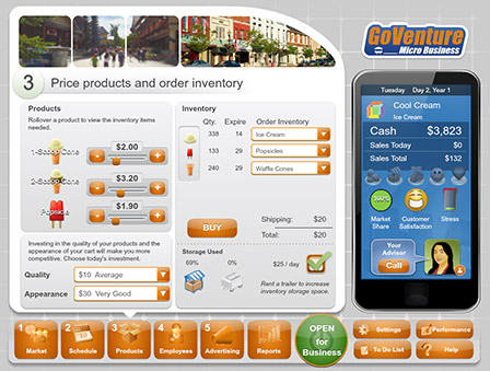 Like a flight simulator for business, GoVenture Micro Business puts you in the role of the owner of a mobile business cart, where you must decide what products to sell and where and when to sell them in order to maximize profits. It’s easy to use, visual, interactive, and exciting!