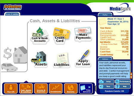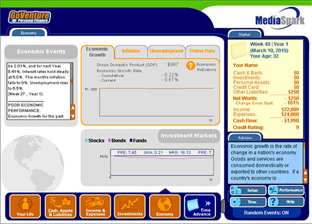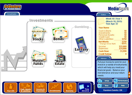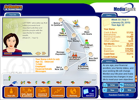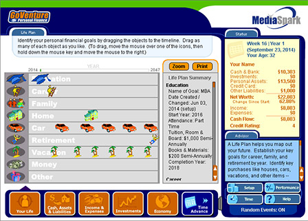 GoVenture Personal Finance simulation is a realistic software simulation designed to help youth and adults learn about personal money management decisions in a fun and educational manner. Like a flight simulator for finance and life, GoVenture Personal Finance enables you to learn-by-doing. It’s easy to use, visual, interactive, and exciting!