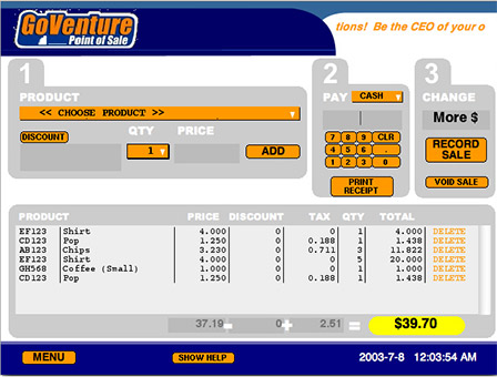 GoVenture Point of Sale is a software program that enables you to accept and record sales. It is perfect for school and student-run businesses, events, fund raisers, garage sales, and for teachers who want an effective simulation for students to experience the sales transaction process.