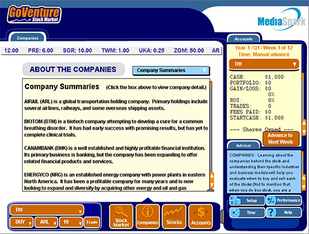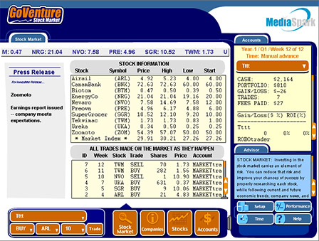 GoVenture Stock Market provides an educational challenge in a simulated environment: a limited number of companies; time condensed and matched to the learner's pace; and company profiles, news, and economic effects in manageable quantities.