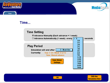 GoVenture Stock Market condenses time into "virtual" weeks, simulating years of economic and market activities in a condensed timeframe. You can start a new simulation at any time, pause it, save it, and return to it later.